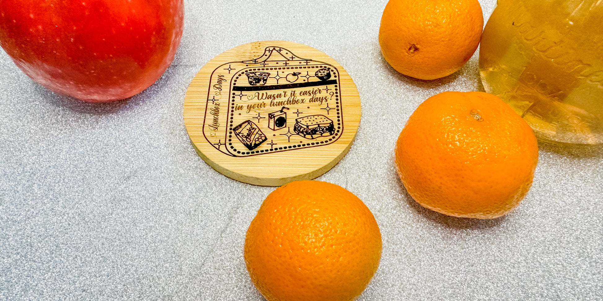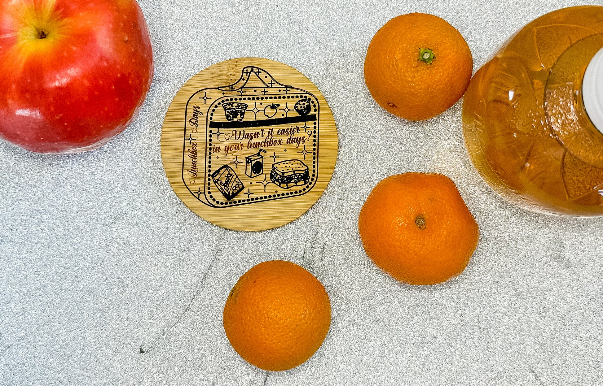 This is the coaster for the Lunchbox Days Patreon for February. It has the design engraved onto the bamboo coaster that matches the one from January.
