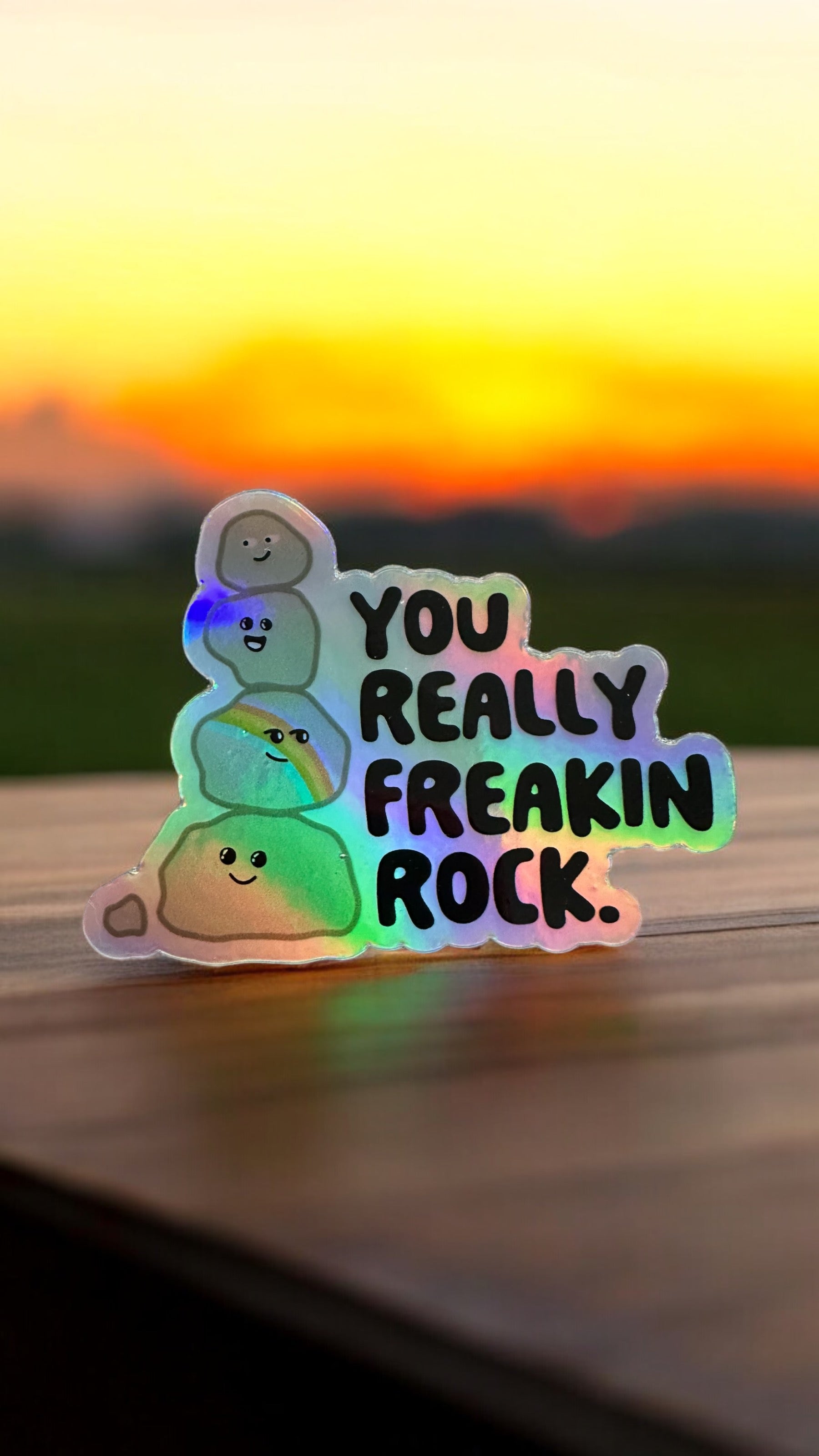 Boost your confidence with our You Really Freakin Rock Sticker! Made with holographic material, this sticker serves as a daily reminder that you are amazing. Stick it on your phone, laptop, or water bottle and let its positive message shine. Show the world that you really freakin rock!