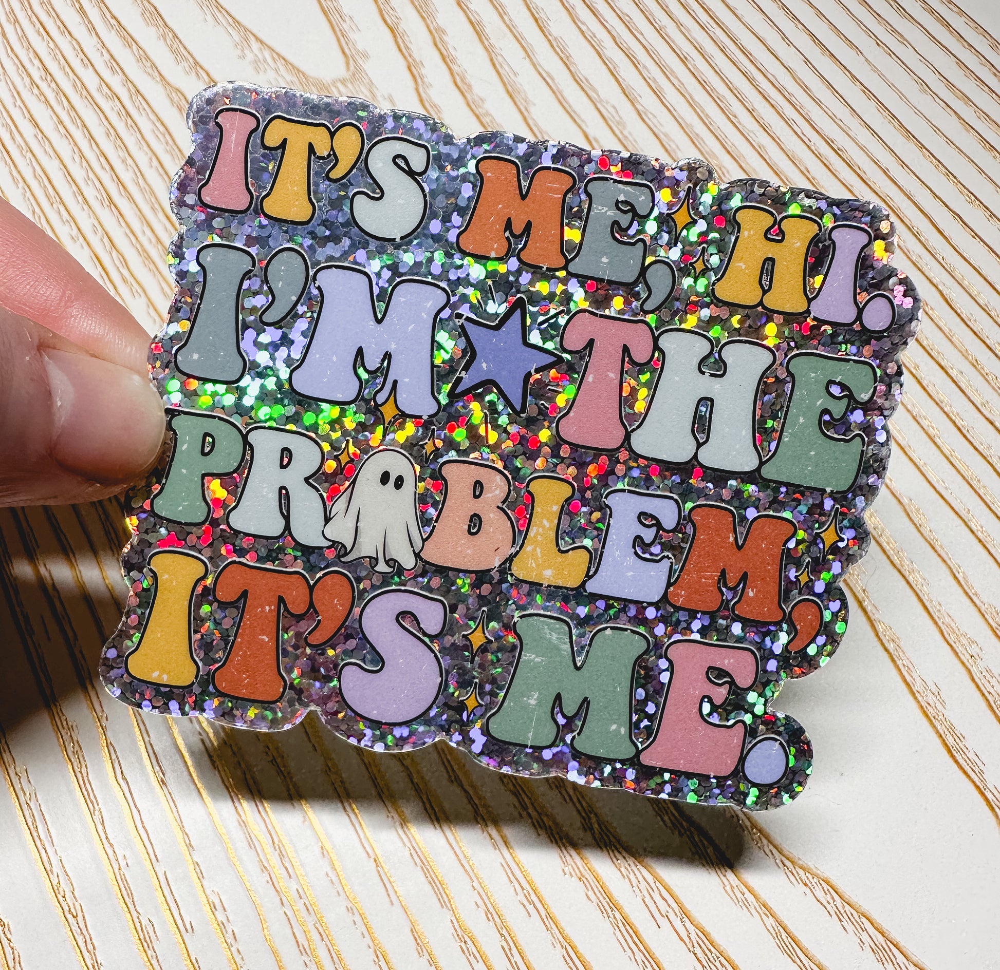 Be the anti-hero ghost of Taylor Swift fandom with this glittery sticker! Declare, "It’s Me, Hi—I’m the Problem" with a fashionable flair and add a little sparkle to your style. Perfect for all Swifties who don’t take themselves too seriously.