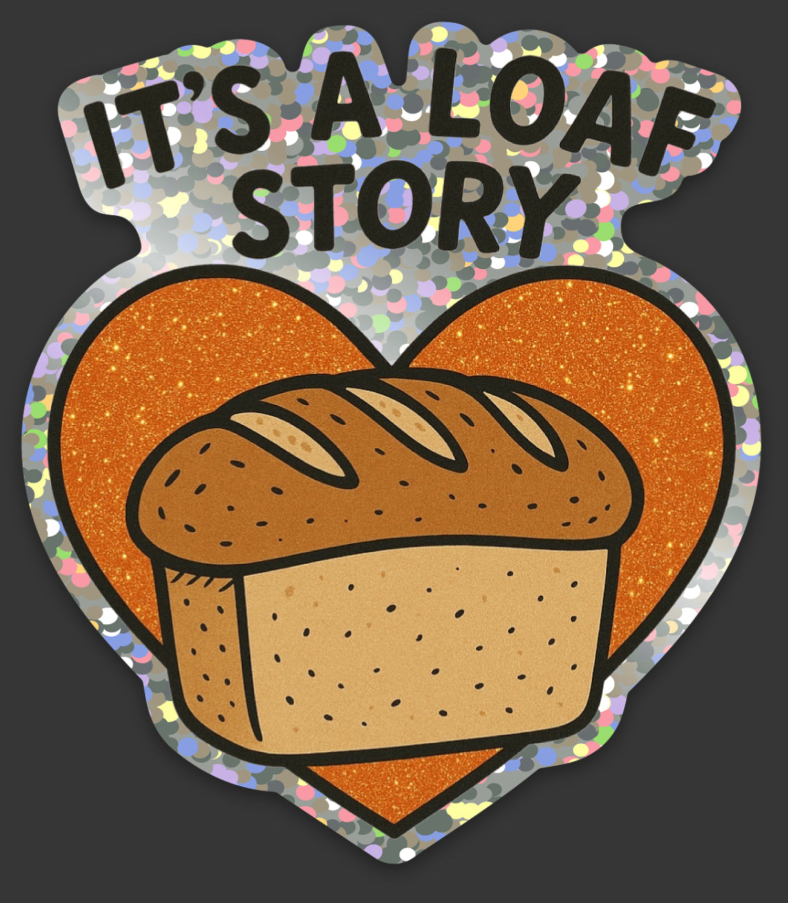 Sprinkle some sparkle onto your life with our "It’s A Loaf Story" sticker! Featuring an orange glitter heart in homage to Taylor Swift's latest album, along with a sourdough pun that will make you smile. Stick it on your laptop, water bottle, or anywhere that needs a touch of fun and personality!
