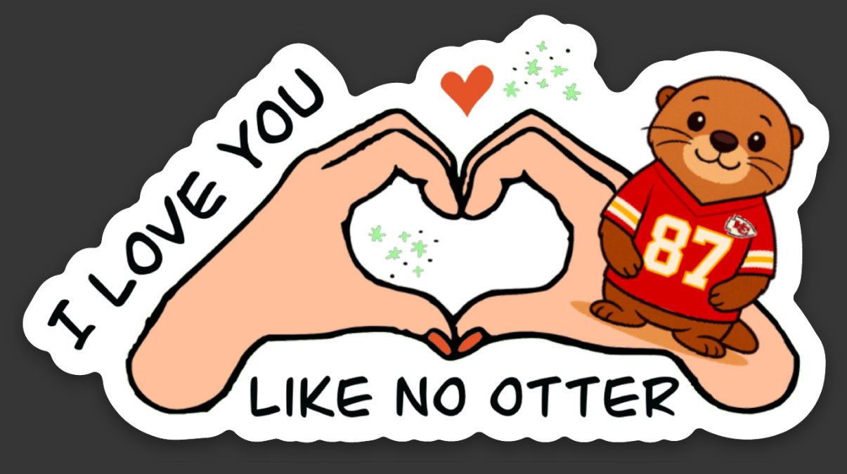 Declare your love in a unique and playful way with the Love You Like No Otter Sticker. Featuring Taylor Swift style heart hands and an otter in a Travis Kelce jersey, this sticker is inspired by the New Heights podcast episode and the newest album, the Life of a Showgirl. Show your love like no other with this one-of-a-kind sticker.