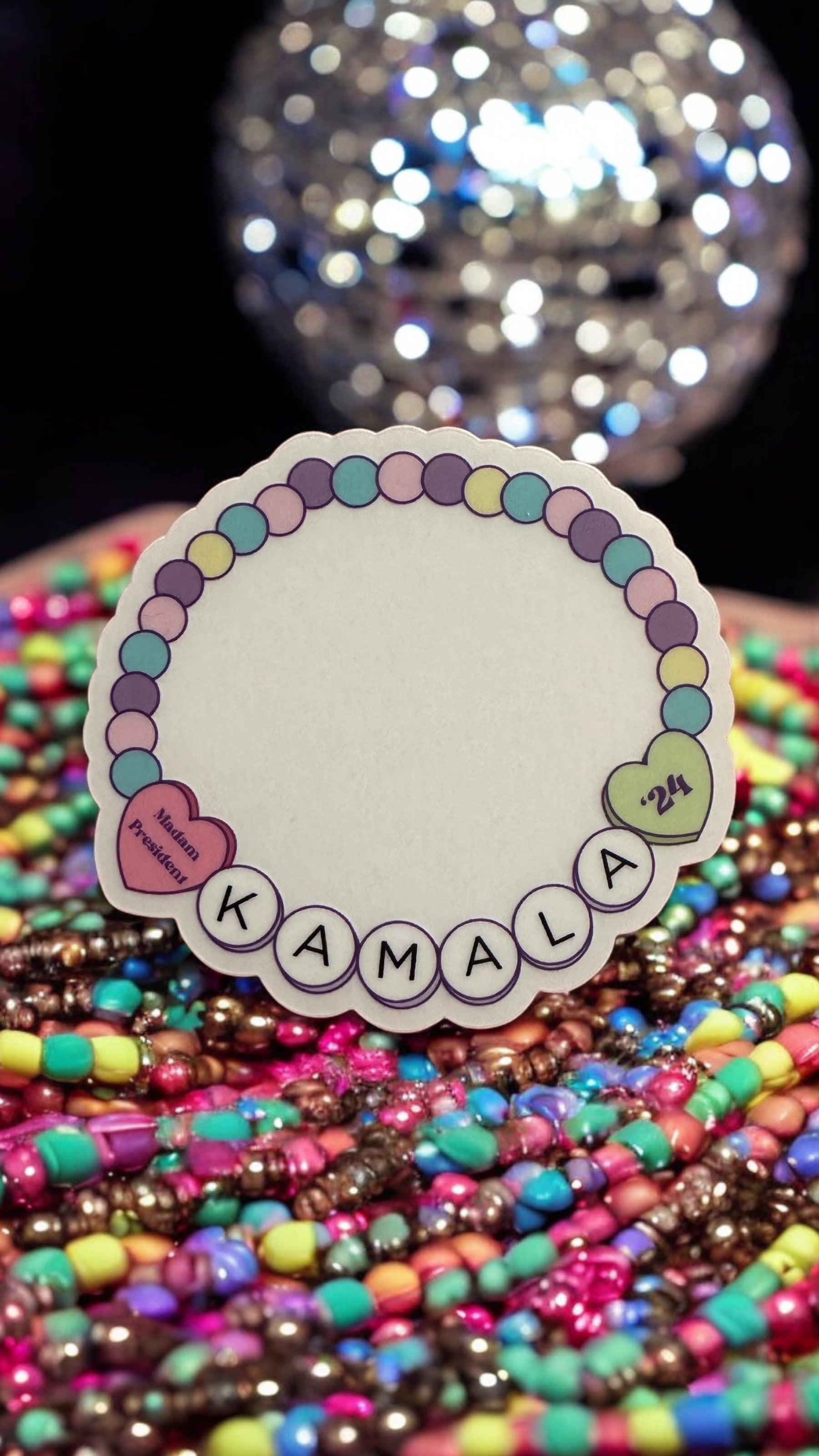 Win the election and show your support for Kamala Harris with this Swiftie-styled sticker that reads "Madam President Kamala '24" in a friendship bracelet design. A quirky and fun way to support your candidate!