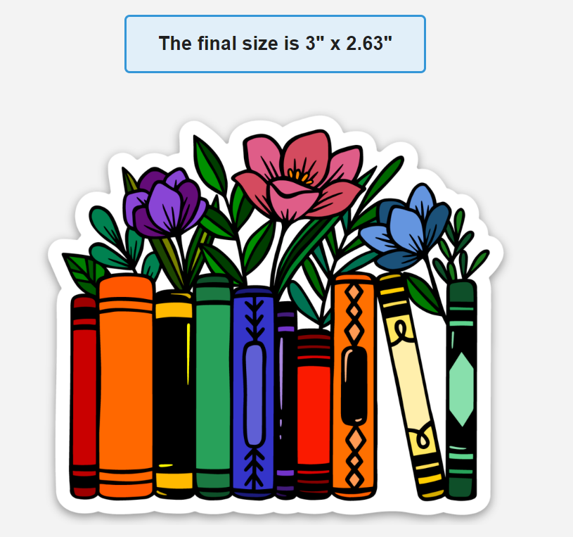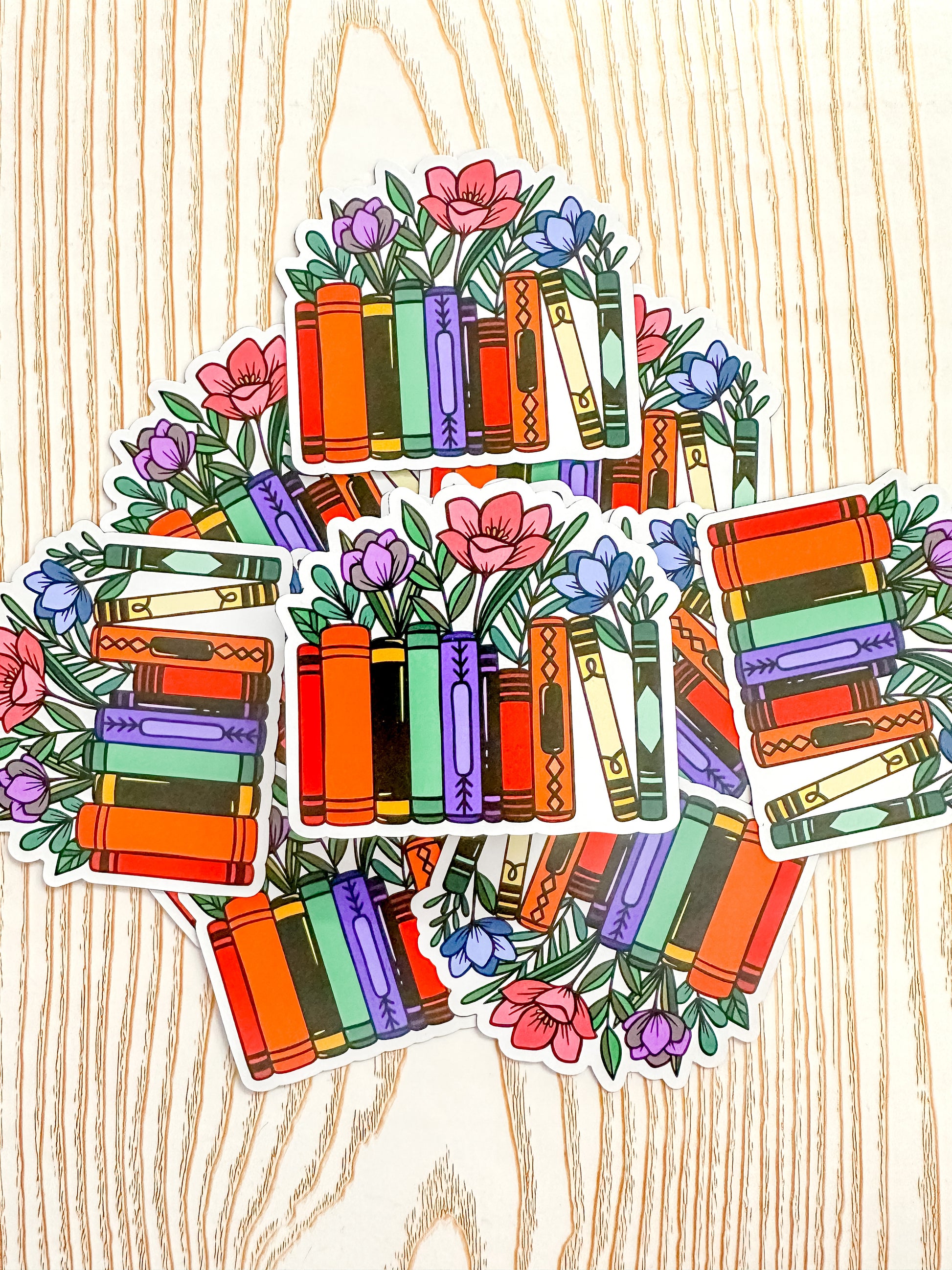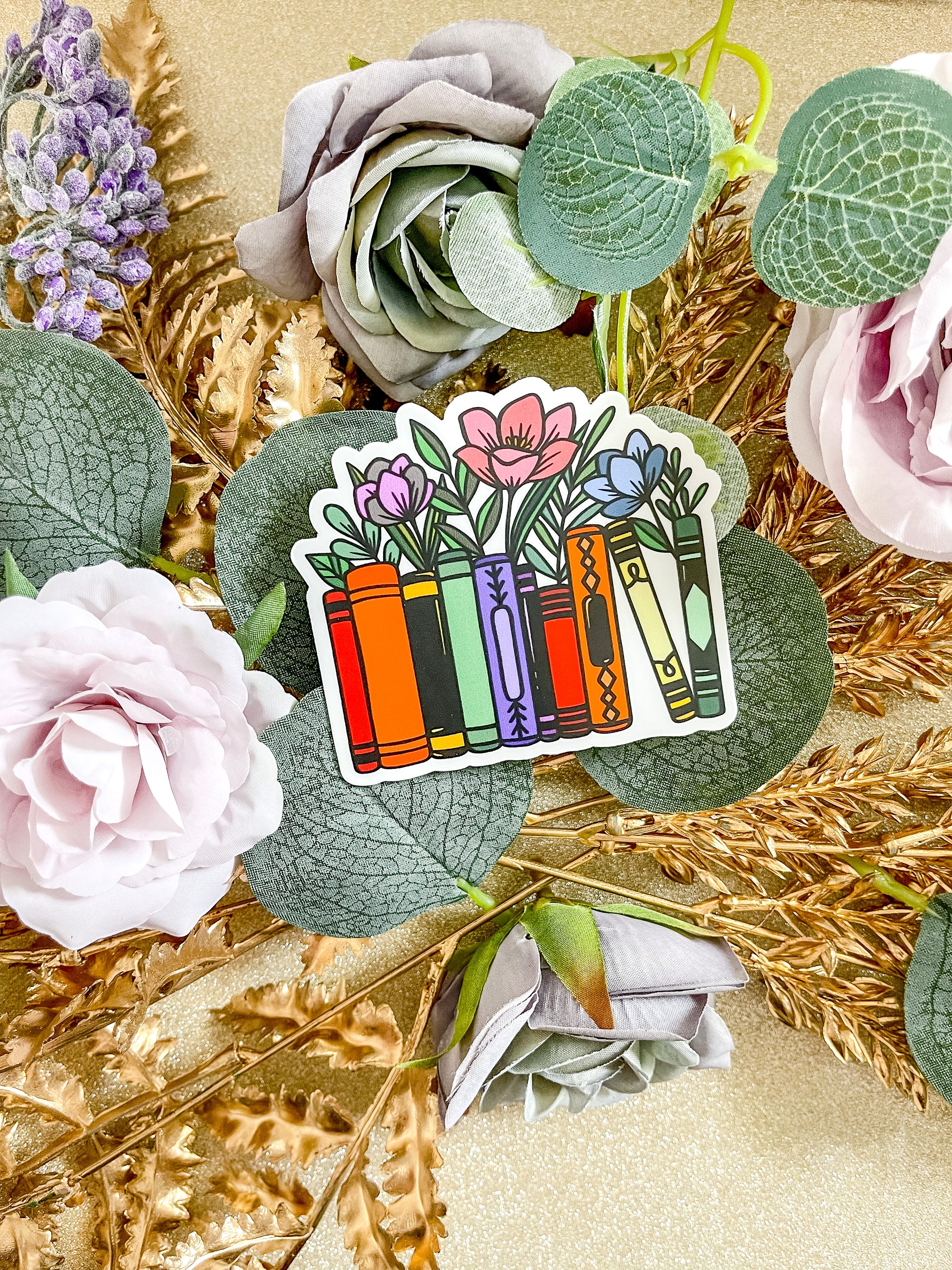 This vibrant water-resistant sticker combines all of my favorite things - books, flowers, and rainbow!