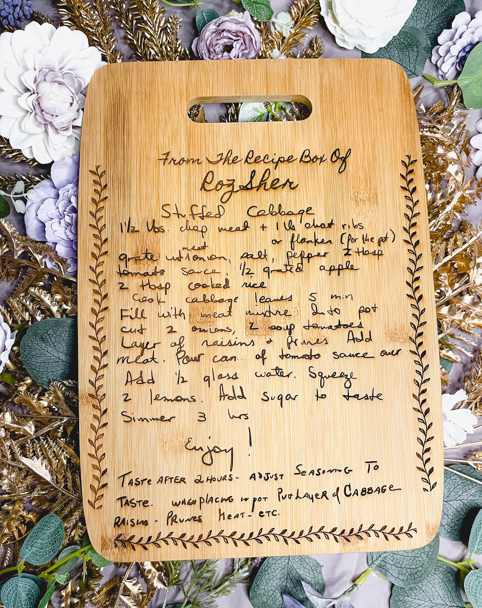 Once you place your order, reply to the confirmation email with clear, well lit photos of the recipe, any photographs of the person you'd like added, and any other details you want included in your design. We'll send you a proof once it's been traced and designed for you to ok before we engrave the board.