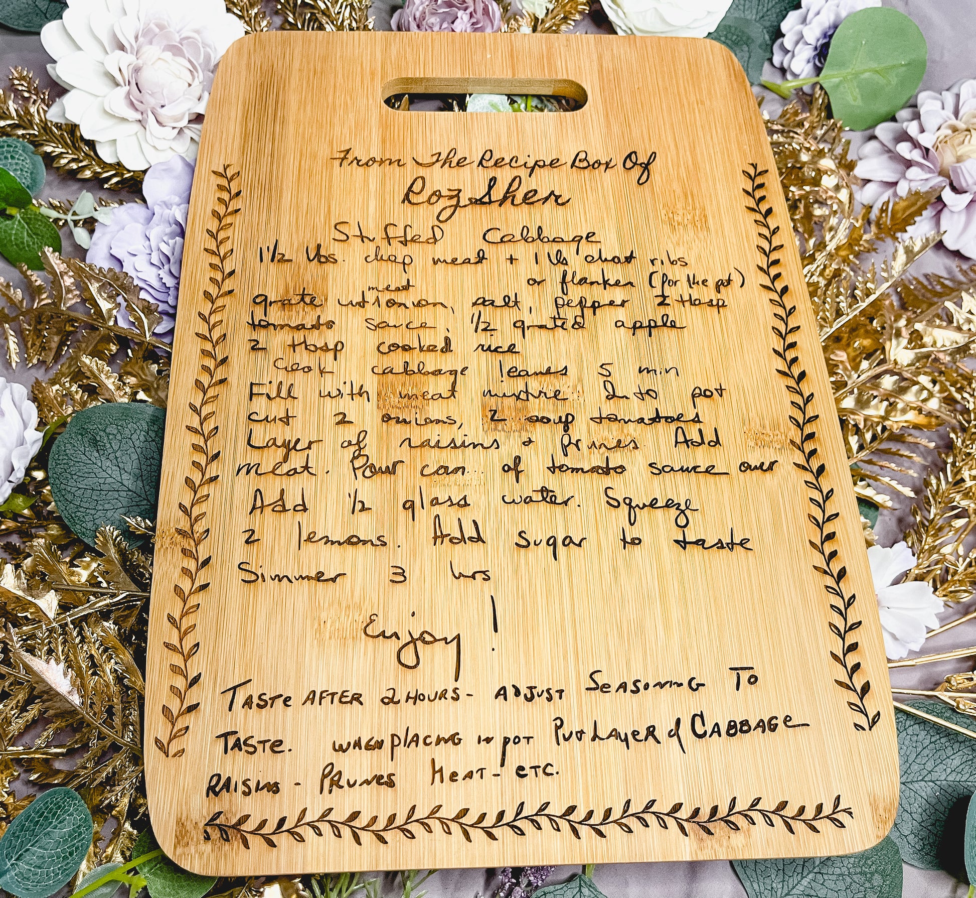 These are some of our favorite cutting boards to design. You send us a picture of a handwritten recipe, note, or anything you want as a special keepsake and we hand trace it and engrave it onto a bamboo cutting board. We also add special embellishments or things that help us tell the story of the person or recipe you want to remember, and we also have the option for you to add a photo to your board. Choose your size and I'll design the board from there!