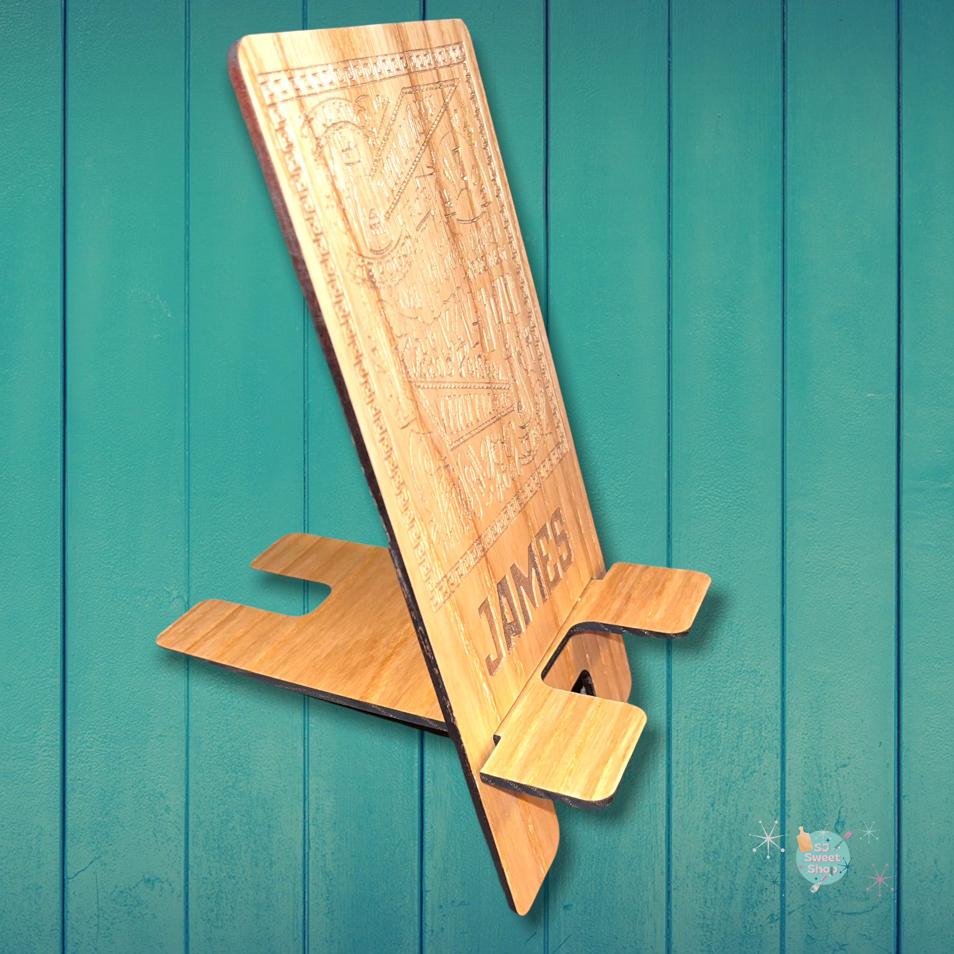 Our custom phone stand is perfect for your desk, bedroom, side table, or like I use mine - in the kitchen! It's great to hold your phone while you watch cooking videos or read a recipe. You can choose anything at all as the design on it. I can put a name, flowers, a favorite character, a quote. Once you order I'll design it and send you a proof before I engrave it.